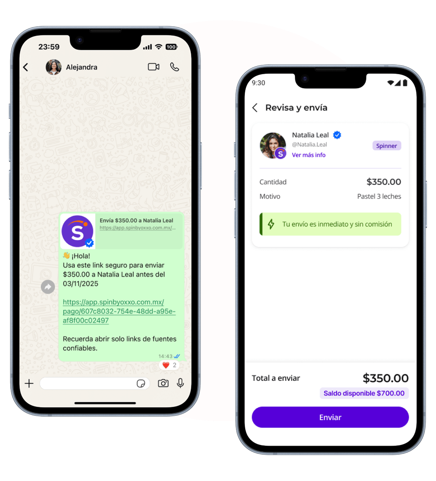 - Si ya tienes Spin, el link abre la app y puedes pagar con transferencia o QR en OXXO.
