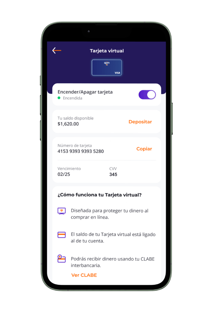 - Toda la información está en la aplicación. Desde la pantalla principal de tu aplicación Spin by OXXO, ve a "Tarjeta virtual" y ahí tienes a la mano todos los datos.